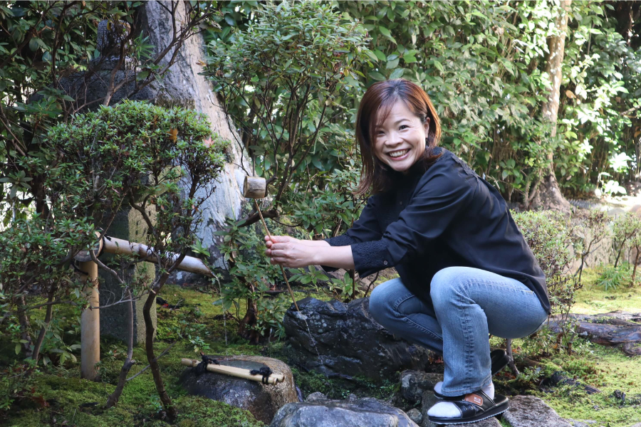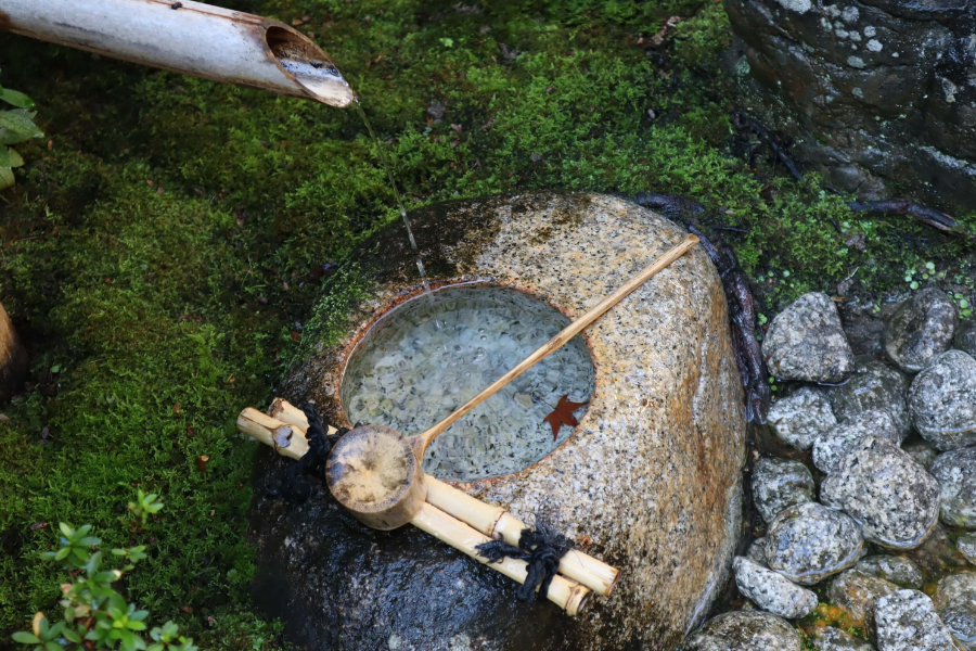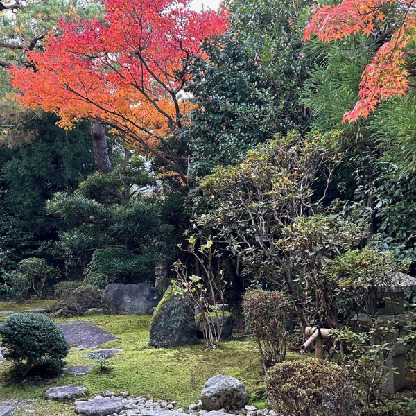 It is late November, the depth of autumn. The tearoom garden in the backyard is a tranquil space where the newly crimson maple leaves create a striking contrast with the deep green moss covering the ground.