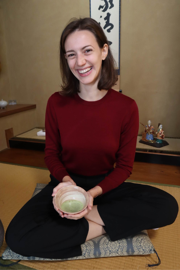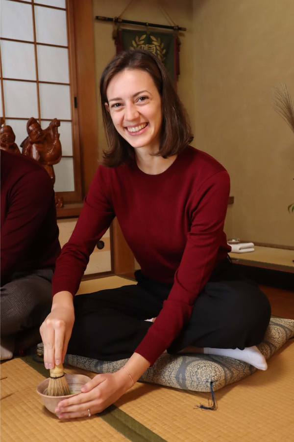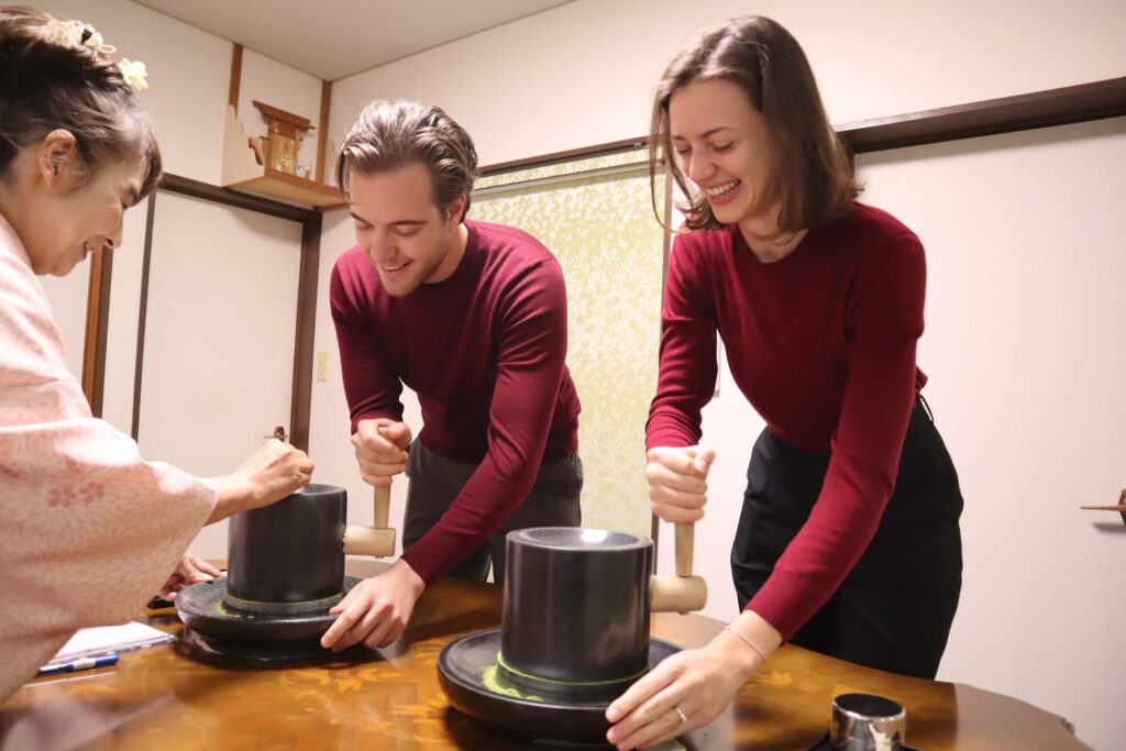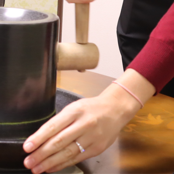 While the two of them were grinding tencha (unpowdered green tea leaves) with a stone mill to make matcha powder, Zsofia started talking about her trip to Nara before coming to Kyoto. “There are so many deer in Nara, and when you feed them, they politely bow their heads to say thank you before eating! They are truly adorable. I just love Nara; I want to go again.” It seemed she had another reason to want to return. “I got my engagement ring from Adam in Nara.” Showing the ring on her left ring finger with a look of pure delight, it must have been a moment she would cherish for a lifetime. Next to her, Adam, who had been grinding the mill, paused and watched her with a warm, gentle smile.
